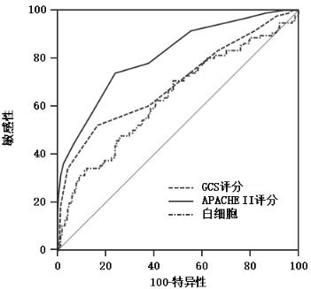 GCS评分、APACHEⅡ评分和白细胞数评估ICU内脑出血患者院内死亡的预测价值,ROC曲线分析显示,GCS评分≤7分、APACHE Ⅱ评分 > 23分、白细胞计数 > 11.26×109/L时,能较好地预测脑出血的死亡结局,其中APACHEⅡ评分的曲线下面积最大,其敏感度和特异度分别为73.96%和75.98%,见图 1表 3