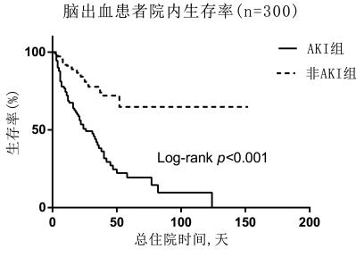 Kaplan-Meier生存曲线结果显示,非AKI患者与AKI患者相比,院内存活率更高(Log rank, χ2=41.12,P < 0.01),见图 2