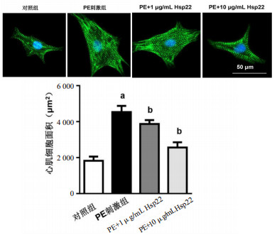 α-actin染色,×400,绿色荧光,细胞核为蓝色荧光;与对照组比较,aP < 0.05;与PE刺激组比较,bP < 0.05 图 2 Hsp22对原代大鼠心肌细胞肥大的影响 Fig 2 The effect of Hsp22 on cardiomyocytes hypertrophy