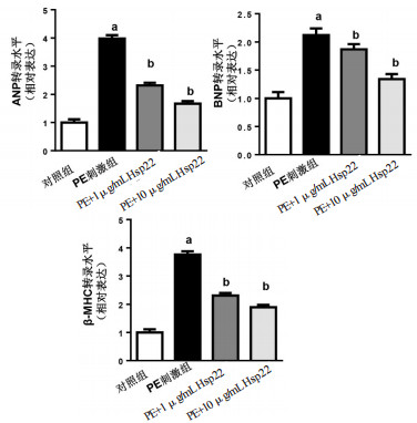 与对照组比较,aP < 0.05;与PE刺激组比较,bP < 0.05 图 3 Hsp22对心肌肥厚标志物转录的影响 Fig 3 The effect of Hsp22 on the transcription level of hypertrophic markers in cardiomyocytes