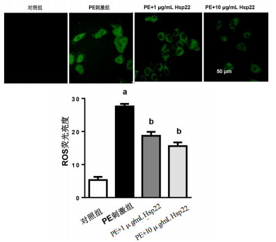 DCFH-DA荧光标记ROS水平(×200,绿色荧光);与对照组比较,aP < 0.05;与PE刺激组比较,bP < 0.05 图 4 Hsp22对心肌细胞氧化应激的影响 Fig 4 The effect of Hsp22 on oxidative stress in cardiomyocytes