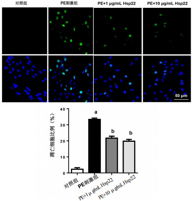 TUNEL染色阳性细胞(×200,绿色荧光);细胞核为蓝色荧光;与对照组比较,aP < 0.05;与PE刺激组比较,bP < 0.05 图 5 Hsp22对心肌细胞凋亡的影响 Fig 5 The effect of Hsp22 on cell apoptosis in cardiomyocytes
