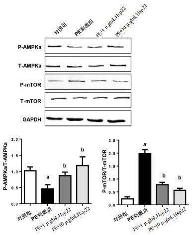 与PE刺激组比较,而1和10μg/mL的Hsp22均能增加AMPKα的磷酸化水平(0.87±0.11和1.18±0.27,t=5.89,P < 0.05;t=5.88,P < 0.05);其下游分子mTOR的磷酸化水平减少(0.78±0.09和0.56±0.08,t=16.80,P < 0.05;t=20.46,P < 0.05),见图 6