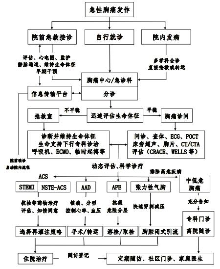 胸痛患者获得医疗救助过程中有5个重要环节:患者、社区医师、调度中心、急救车和急诊科[3],各环节均能影响胸痛患者诊疗效率。我国胸痛救治现状存在以下问题:部分患者对胸痛认知度和应变能力差,常有患者就诊“延误”;院前及远程救治能力相对薄弱,院前院内无缝衔接仍需完善;各级医疗单位间协同救治配合欠流畅;院内各专业会诊为主的传统模式亟待进一步优化。本共识通过规范和完善胸痛急诊救治体系,对提升急性胸痛各环节诊疗水平,改善患者预后具有重要的现实应用价值。