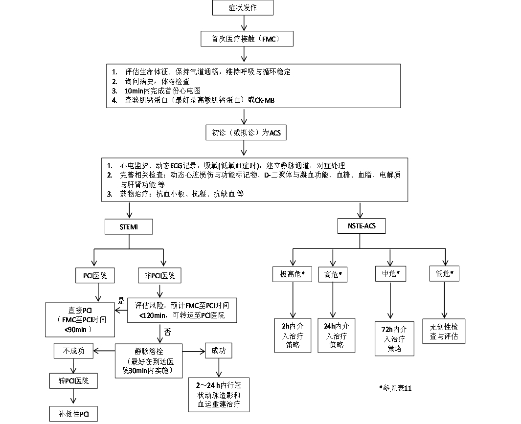 | 患者就诊(或FMC)后10 min内行标准12导联甚或18导联心电图检查,并动态记录,有条件者行多功能心电监护。 | Ⅰ | C |