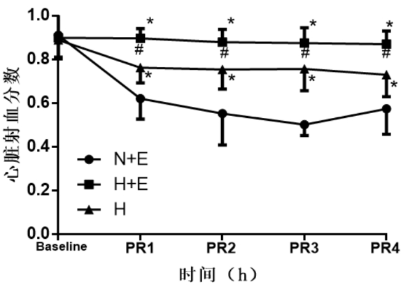 | 与N+E组比较,aP < 0.05;与H组比较,bP < 0.05。PR:复苏后 图 3 三组大鼠心输出量比较 Fig 3 The comparison of cardiac output in three groups |