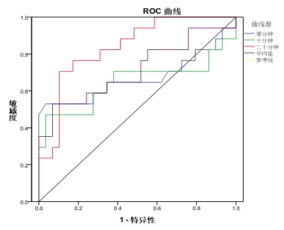 | 图 1 不同时点PETCO2值预测自主循环恢复的ROC曲线 |