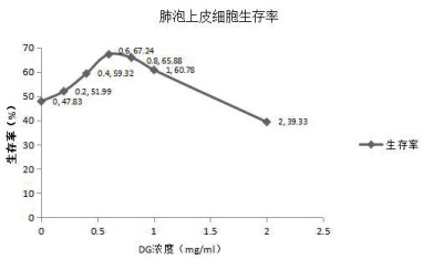 取处于对数生长期的细胞用胰蛋白酶消化后,接种于96孔板,培养24 h,分别加入0、0.2、0.4、0.6、0.8、1、2、4 mg/mL浓度DG孵育2 h,再以对应浓度的DG+1 000 μmol/L PQ孵育24 h后加入10 μL MTT(5 mg/ mL),继续培养4 h后加入二甲基亚砜(DMSO)150 μL/孔,酶标仪570 nm测定吸光度(A值),计算细胞存活率。存活率(%)=用药组A值/对照组A值孵育×100%。