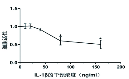 1.3.2 原代细胞药物处理及实验分组CCK-8测定IL-1β的干预浓度。方法按照制造商的说明书进行。原代培养的神经元(3×103/孔)用不同浓度(0、10、20、40、80、160 ng/mL)的IL-1β在96孔板中培养24 h,然后将10 μL CCK-8工作溶液加入到每个孔中,在37 ℃下温育6 h。用酶标仪检测450 nm波长下每孔的吸光度(A)值。原代细胞以2×106/孔的密度接种在六孔板上。培养24 h后,随机分为对照组(0.01 mol/L PBS)、IL-1β(40 ng/mL)组、IL-1β(40 ng/mL) +IL-1Ra (40 ng/mL)组、IL-1Ra (40 ng/mL)组。