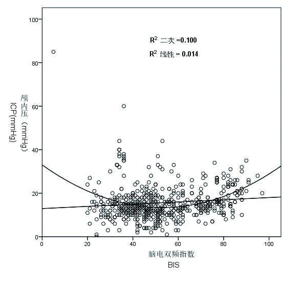 二次项曲线模型显示当BIS值在55左右时ICP值最低,且模型拟合度也显著高于线性模型(R2=0.1),这提示将TBI患者的BIS值控制在55左右对ICP的控制可能最为有利 图 1 BIS指数与ICP值的线性相关与曲线相关散点图