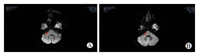 | A:患者A的头颅DWI; B:患者B的头颅DWI; 红色箭头所示为梗死部位 图 1 二例患者的头颅DWI |