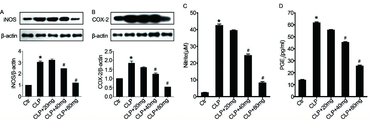 在脓毒症小鼠中,iNOS和COX-2分别通过NO和前列腺素介导炎症过程[11, 40-41]。如图 5C5D所示,用木犀草素预处理能够以剂量依赖性的方式降低ALI小鼠肺组织中NO和PGE 2的水平。这些结果与木犀草素预处理的脓毒症小鼠中iNOS和COX-2表达的数据一致。