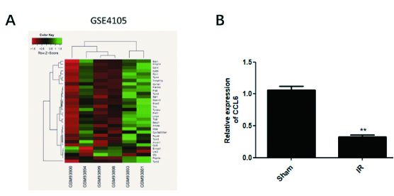 2 结果 2.1 GEO公共数据库分析CCL6在缺血-再灌注心肌组织和正常心肌组织中的表达差异对GSE4105数据集进行分析,热图结果显示CCL6在缺血-再灌注心肌组织中的表达低于正常心肌组织(图 1A)。此外,荧光定量PCR结果显示,缺血-再灌注导致心肌组织中CCL6 mRNA水平显著降低(P < 0.05)(图 1B),这些结果表明CCL6在缺血-再灌注心肌组织中表达水平降低,可能在心肌损伤中发挥一定的作用。