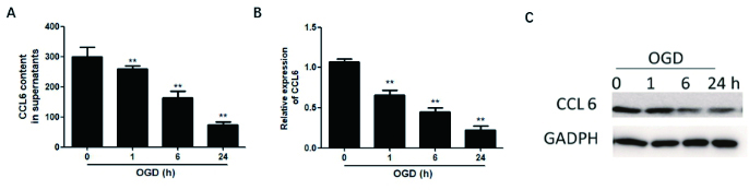 | 采用OGD处理H9C2细胞不同时间后,检测细胞上清(A)和细胞裂解液(B和C)CCL6表达情况。aP < 0.01 图 2 氧葡萄糖剥夺对H9C2细胞中CCL6表达影响 Fig 2 Effect of oxygen glucose deprivation on CCL6 expression in H9C2 cells |