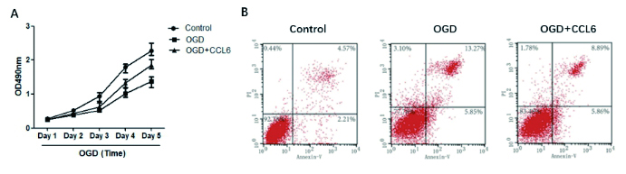 | 采用OGD和CCL6处理H9C2细胞后,检测细胞活力(A)和凋亡情况(B) 图 3 氧葡萄糖剥夺和CCL6处理对H9C2细胞活力和凋亡的影响 Fig 3 Effects of oxygen glucose deprivation and CCL6 treatment on viability and apoptosis of H9C2 cells |