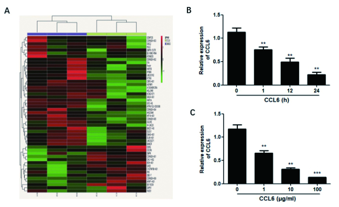 1.2.4 ELISA测定CCL6含量使用ELISA检测试剂盒(USCNLIFE, 武汉, China),根据厂家的标准步骤,检测细胞培养上清中CCL6含量。