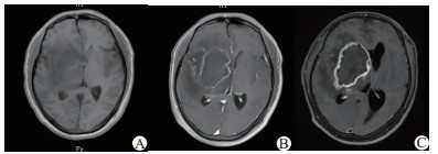 | A:8月5日MRI增强:病变未强化;B:8月12日MRI增强:病变呈环形不均匀强化,局部脑膜可见线样强化;C:8月22日MRI增强:病变呈环形强化,范围较前扩大 图 1 患者入院后MRI增强影像结果 |