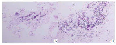 | A: HE染色×100;B: HE染色×200 图 2 患者病理检查形态符合毛霉菌 |