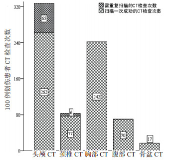 图 1 100例创伤患者各部位CT检查的重复扫描情况