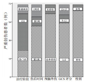 需要重复扫描的71次的CT检查主要集中于伤后早期,其中62次(87.3%)的CT检查在急门诊和ICU阶段,50次(70.4%)在伤后第1周。需要重复CT扫描的患者多合并颅脑外伤,伴有意识障碍,62次(87.3%)的CT检查患者合并颅脑外伤,53次(74.6%)的CT检查患者GCS评分低于9分。此外,65次(91.5%)的CT检查患者为男性(图 2)。