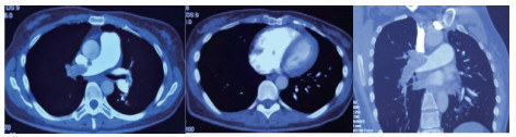 | 图 2 入院时CTPA提示双肺主干明确充盈缺损 |
