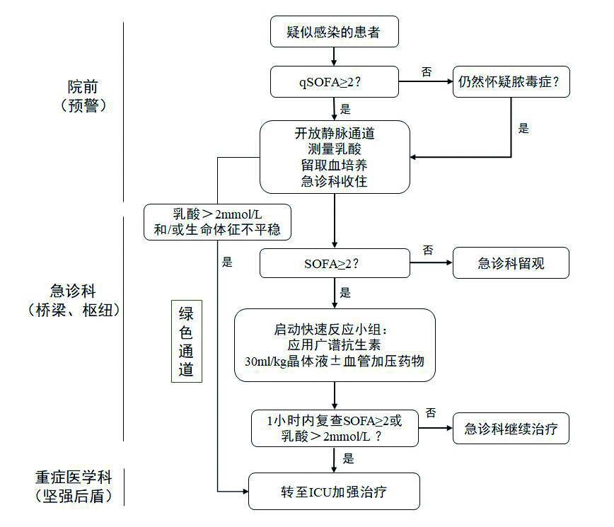 4.2 分秒必争,推进决定性治疗前移最新SSC指南和脓毒症Bundle要求对脓毒症患者1 h内启动干预措施。在急诊科诊断的脓毒症患者如果在转入重症加强治疗病房(intensive care unit,ICU)后才进行治疗,往往已经超过了1 h甚至3 h。为了使脓毒症患者得到更早的治疗,应将决定性治疗前移至急诊科[13]。脓毒症患者到达急诊科后由急诊科医师、重症医师共同管理和治疗,突破科室界限,精诚合作,争分夺秒,通过一体化救治实现决定性治疗前移。以急诊科为平台,成立包括急诊科医师、重症医师、急诊科护士、临床药师等在内的快速反应小组(rapid response team,RRT),以小组为单位实行24小时/7天轮班制,负责与EMS对接以及院内、急诊室内可疑脓毒症患者的快速诊断与抢救。与心肌梗死小组、创伤小组类似,RRT应是一支专而强的队伍[14]。对RRT成员进行脓毒症理论和技能培训,要求每位成员不仅具有急诊急救技能,还要熟悉ICU综合救治。