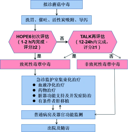 若HOPE6评分≥2分,则考虑致死性蘑菇中毒,患者需立即转入急诊监护室启动集束化治疗;若HOPE6评分<2分,则需要对患者进行是否为致死性蘑菇中毒的再评估。