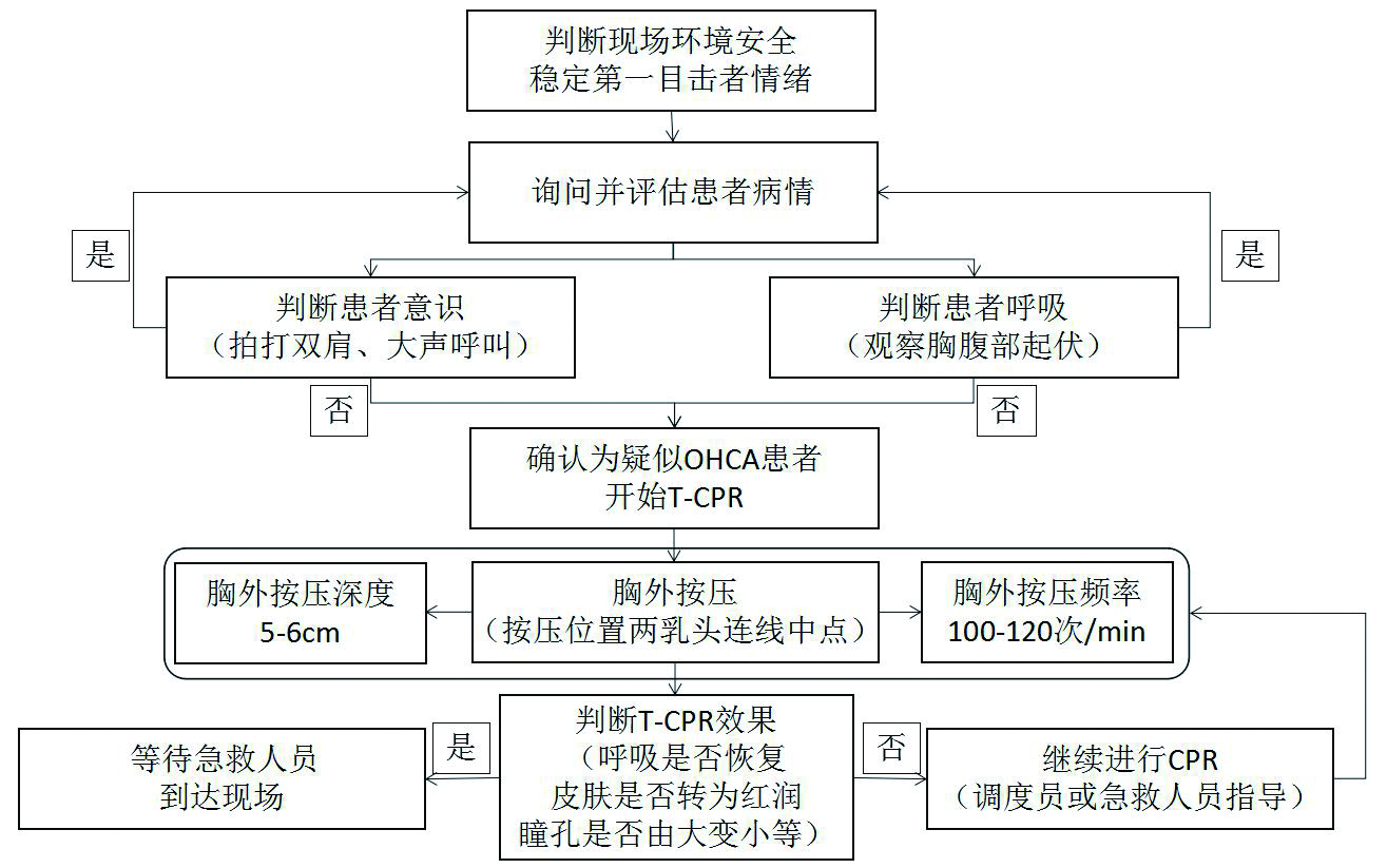 6 T-CPR指导流程调度员接到求救电话通过询问评估患者病情,对疑似OHAC患者,立即启动T-CPR,具体流程如下(见图 1)。