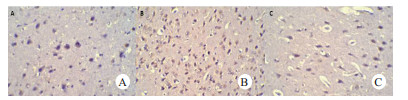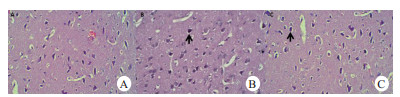 大脑额叶皮质中央前回受损神经元变化包括胞浆红染、Nissl体减少和核固缩(箭头所示)。假手术组(A)神经元基本正常,丁苯酞组(C)受损的神经元数显著低于对照组(B) 图 1 大脑额叶皮质中央前回组织病理学变化(HE×200) Fig 1 Histopathological changes in the central anterior gyrus of the cerebral frontal cortex(HE×200)