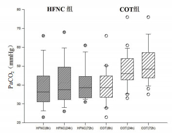 脱机拔管后患者循环及呼吸参数见表 2:脱机拔管后6 h HFNC组患者呼吸频率、氧饱和度(SaO2)、氧合指数(PaO2/FiO2)均优于COT组(P<0.05),患者心率、平均动脉压(MAP)、血气分析中二氧化碳分压(PaCO2)两组差异无统计学意义(P=0.39);脱机拔管后24 h、72 h HFNC组PaO2/FiO2优于COT组(P<0.05),HFNC组患者PaCO2值显著小于COT组(P<0.05),脱机拔管后24 h血氧饱和度(SaO2)HFNC组优于COT组(P<0.05),但72 h血氧饱和度(SaO2)两组差异无统计学意义(P=0.21)、呼吸频率、心率及平均动脉压(MAP)两组差异无统计学意义。图 2可见HFNC组患者氧合指数在各时间点均优于COT组。图 3可见在24 h、72 h HFNC组患者PaCO2值显著小于COT组。