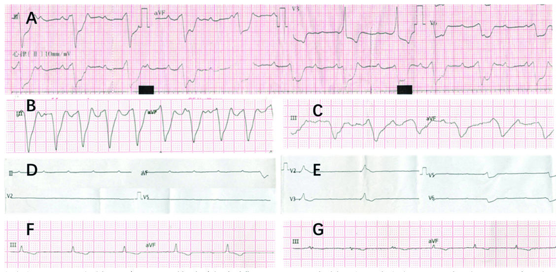 A:院前三度AVB伴室性逸搏。ECMO支持后心电图:B:室速;C:加速性室性逸搏;D:三度AVB伴心室静止:有p波,无QRS波;E:临时心脏起搏联合艾司洛尔控制心室率35次/min;F:交界性逸搏心律;G:恢复窦性心律 图 1 患者心电图