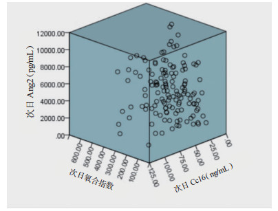 | 图 2 ARDS患者次日Ang-2、CC16和氧合指数间两两的关系(n=100) Fig 2 The correlation between Ang-2, CC16 and oxygenation index in the second day in ARDS patients (n=100) |
