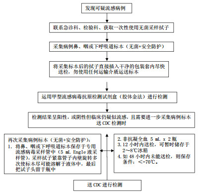 快速鉴定流感病毒亚型对及时救治感染病例以及制定有效的流感疫情防控措施有着至关重要的作用。发病3天内呼吸道标本检测阳性率较高。有创机械通气病例应尽快采集气管内吸引物或支气管肺泡灌洗液,而不应常规采集非呼吸道标本(如血、血浆、血清、脑脊液、尿和大便等)行流感检测[55]。急诊采集病原学标本时除无菌操作外,应严格执行个人防护措施,以防交叉感染。详细急诊病原学标本采集技术见图 1