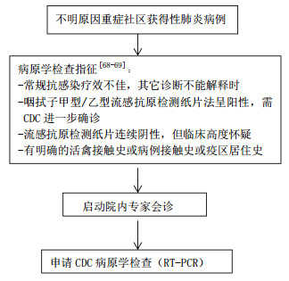 对不明原因重症社区获得性肺炎病例满足以下条件时需及时启动CDC病毒核酸检测:①抗感染治疗无效,不能用常见细菌或真菌性感染解释时;②连续2次及2次以上甲型/乙型流感抗原检测纸片法呈阳性,需要CDC进一步确诊流感的;③抗原检测纸片法连续阴性,但临床高度怀疑,需要CDC行病毒核酸检测。流程见图 3