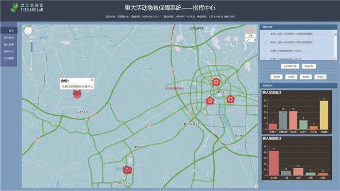 | 图 2 指挥调度中心显示会场、救护车、医院、专家的信息并制作统计报表 Fig 2 The command and dispatch center displaying the information of the venue, ambulance, hospital, and experts, and producing statistical reports |