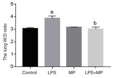 | 与Control组比较, aP < 0.05;与LPS组比较, bP < 0.05 图 1 各组小鼠肺组织W/D变化 Fig 1 The lung W/D ratio in mice |