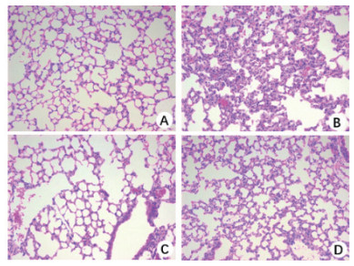光镜下,肺组织病理切片可见对照组(A)和单纯MP组(C)小鼠的肺组织结构基本正常,肺泡腔及肺间质结构清晰,肺泡壁薄,肺泡间偶见炎性细胞浸润; LPS造模组(B)小鼠肺泡间隔增宽,肺间质水肿、炎细胞浸润,可见肺泡萎陷及肺泡内渗出性病变; 而MP干预组(D)小鼠的肺组织病理损伤程度较LPS组明显减轻,表现为肺泡间隔轻度增宽,炎症细胞浸润较LPS组明显减少,无明显肺泡萎陷,肺泡结构完整(图 2)。