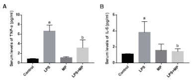 与Control组[(0.82±0.12)pg/mL,(1.12±0.02)pg/mL]相比,LPS组小鼠血清TNF-α和IL-6水平[(6.61±1.27)pg/mL,(3.80±1.35)pg/mL]显著升高。单纯MP处理组小鼠血清TNF-α和IL-6水平[(1.11±0.19)pg/mL,(1.54±0.82)pg/mL]与对照组差异无统计学意义。MP干预处理显著抑制LPS引起的小鼠血清TNF-α和IL-6水平升高[(3.17±1.64)pg/mL,(1.42±0.35)pg/mL],差异有统计学意义( F= 51.91, P= 0.003; F= 18.43, P= 0.008)(图 3)。