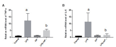 LPS处理小鼠24 h后,其肺组织内TNF-α和IL-6的mRNA表达水平(12.2±5.05, 11.12±6.56)显著高于control组(1.06±0.40,1.00±0.12); 单纯MP处理,不影响肺组织内TNF-α和IL-6 mRNA水平(1.31±0.27,1.40 ± 0.35); 而LPS+MP组TNF-α和IL-6的mRNA相对表达量(5.10±0.81,1.62±1.00)显著低于LPS组表达量,差异有统计学意义( F= 32.73,P= 0.03; F= 17.32,P= 0.026)(图 4)。