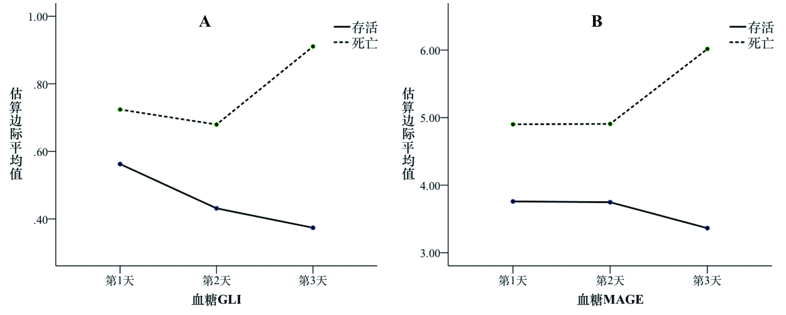 本研究共收集CGMS血糖数据52 626例次,存活组和死亡组CGMS血糖分别为(9.17±1.87)mmol/L,(9.62±2.80)mmol/L。CGMS血糖变异度相关指标(血糖最大差值、SD、CV、GLI、MAGE)及连续3 d的变化情况见表 2。死亡组GLI、MAGE显著高于存活组(P=0.029,P=0.036)。存活组与死亡组每日GLI、MAGE的重复测量方差分析结果显示,两组间每日GLI、MAGE差异有统计学意义(组间因素,P=0.005;P=0.009)。同时,GLI与MAGE在存活组呈下降趋势,死亡组呈上升趋势,两者随时间变化差异有统计学意义(交互作用,P=0.011,P=0.008)。此外,每日GLI、MAGE之间差异无统计学意义,见表 3、图 3。