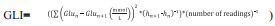 CGMS血糖数据导出后计算GV相关指标,包括:血糖平均数、血糖最高值、血糖最低值、血糖标准差(standard deviation, SD)、血糖不稳定指数(glucose lability index, GLI;