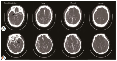 | A:55岁女性,NIHSS 11分,mCTA显示RMCA闭塞,ASPECTS侧支循环得分为4分,表明侧支循环良好;B:51岁女性,NIHSS 14分,mCTA显示LMCA闭塞,ASPECTS侧支循环得分为2分,表明侧支循环不良 图 1 采用ASPECTS侧支循环六点量表评分法对患者进行侧支水平评估 Fig 1 Assessment of collateral levels in patients using the ASPECTS collateral circulation six-point scale |