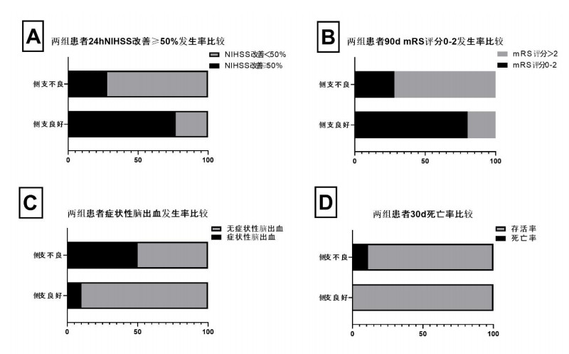 溶栓前NIHSS评分两组间比较差异无统计学意义(P > 0.05),提示两组具有可比性。侧支良好组的溶栓后24 h NIHSS评分、90 d溶栓mRS评分、症状性脑出血发生率明显低于侧支不良组(4.6±5.6)vs(12.5±8.4),(P < 0.01);(1.7±1.7)vs(3.1±1.5),(P < 0.05);9.7% vs 50.0%,(P < 0.05);侧支良好组溶栓后24 h NIHSS评分改善≥50%发生率、90 d mRS 0-2分发生率显著高于侧支不良组(77.4% vs 27.8%,P < 0.05;80.6% vs 27.8%,P < 0.01)。两组间溶栓后30 db病死率差异无统计学意义(P > 0.05),但侧支不良组30 d病死率高于侧支良好组(11.1% vs 0%)(表 2,图 2)。