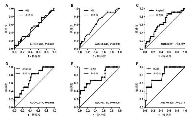 2.5 TEG参数在预测CCTs参数异常中的价值根据具有相似临床价值的TEG和CCTs参数,分析两者间的相互诊断价值。本研究中,以R值判断APTT < 23 s的敏感度和特异度分别为69.6%、63.5%,曲线下面积(area under the curve,AUC)为0.469(P=0.645)(图 1A),表明R值对预测APTT降低(高凝状态)无诊断价值。以K值判断TT > 20 s的敏感度和特异度分别为73.9%、48.2%,AUC为0.648(P=0.030)(图 1B);以Angle值判断TT > 20 s的敏感度和特异度分别为87.0%、55.3%,AUC为0.651(P=0.027)(图 1C),表明K值和Angle值对预测TT升高(低凝状态)具有较低的诊断价值。以Angle值判断FIB > 4 g/L的敏感度和特异度分别为83.3%、42.7%,AUC为0.717(P=0.015)(图 1D);以MA值判断FIB > 4 g/L的敏感度和特异度分别为58.3%、16.7%,AUC为0.747(P=0.005)(图 1E);以MA值判断PLT > 300×109/L的敏感度和特异度分别为99.0%、49.0%,AUC为0.808(图 1F),表明Angle值和MA值对FIB、PLT水平升高(高凝状态)具有中等的预测价值。TEG参数判断CCTs结果异常的最佳截断点的结果见表 5。