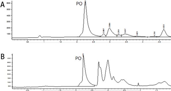 | A:血浆;B:肺组织 图 1 百草枯高效液相色谱图 |