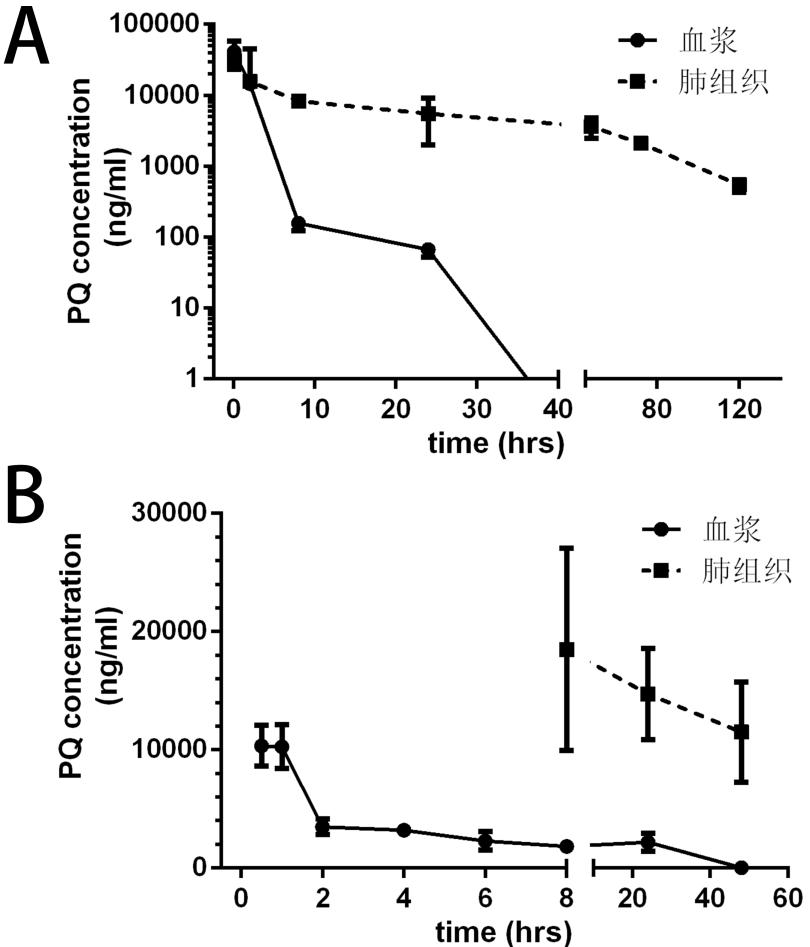 | 图 2 百草枯经腹腔注射(图A)及经灌胃(图B)给药后平均血药浓度-时间曲线 |