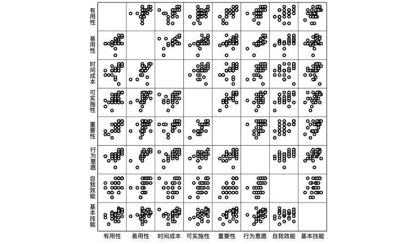 8个分组因素之间绘散点图(图 2)。呈较好的线性相关。相关性分析提示,行为意愿与易用性相关性最强(r=0.742),与有用性(r=0.544)和时间成本(r=0.526)相关(P < 0.01);易用性与时间成本(r=0.483)与自我效能(r=0.543)分别相关(P < 0.01);有用性与记录信息的可实施性(r=0.624)、记录信息的重要性(r=0.682)及基本技能(r=0.480)分别相关(P < 0.01)。