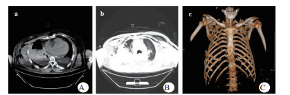 | 图 1 A胸部CT纵隔窗(右侧胸壁塌陷);B胸部CT肺窗(广泛皮下积气,肺挫伤);C肋骨三维重建(多根多处肋骨骨折)。 |