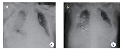 | 图 2 A入院第一天床边胸片;B术后当天床边胸片。 |