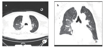 | 图 3 A撤离ECMO第一天胸部CT;B撤离ECMO第一天胸部CT立体成像。 |